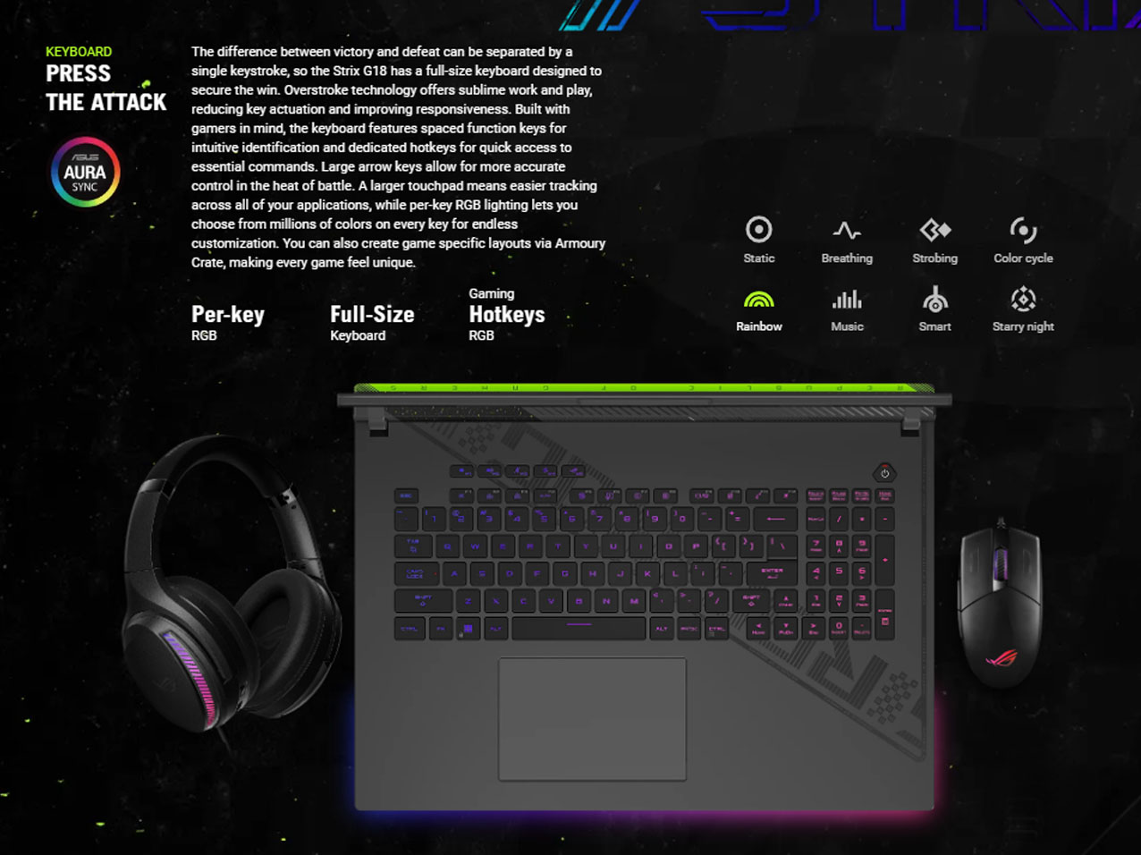 Ngoài ra, hệ thống LED nền RGB độc lập trên mỗi phím, cho phép bạn có thể thoải mái Setup theo ý thích. Ứng dụng Armory Crate, cho phép bạn tự do tạo bố cục phím cho trò chơi, giúp tăng cảm hứng khi vào trận cực kỳ tốt.